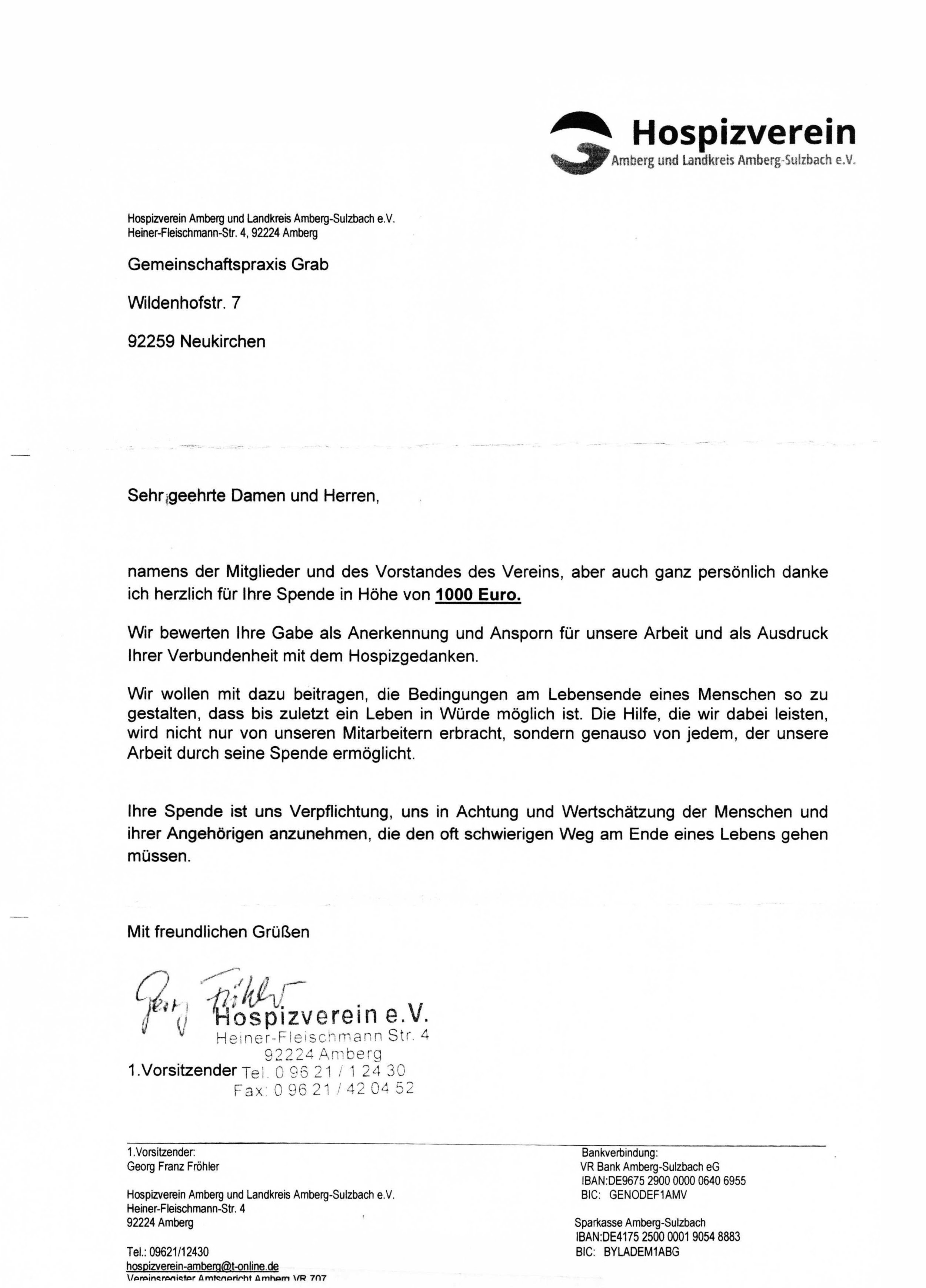 €1000.- an den Hospizverein Amberg gespendet.